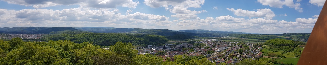 Vom Turm eröffnet sich ein schöner Blick über den Ort Tiengen, das untere Wutachtal bis zur Küssaburg und den Hochrhein bei Waldshut.