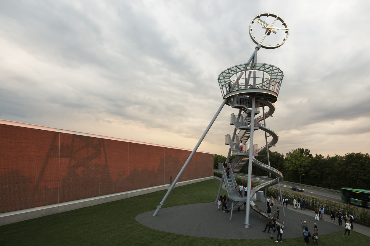 Auf der Aussichtsplattform, die auf 17 Metern Höhe liegt, hat man eine Aussicht auf das ganze Vitra Campus-Gelände und das Umland. Hier oben ist außerdem der Ausgangspunkt der 38 Meter langen Röhren-Kurven-Rutschbahn.