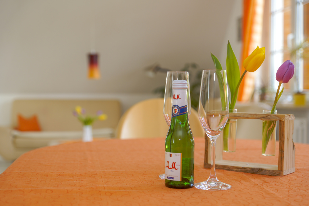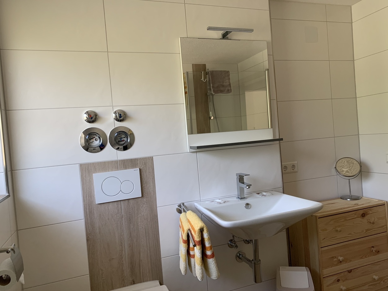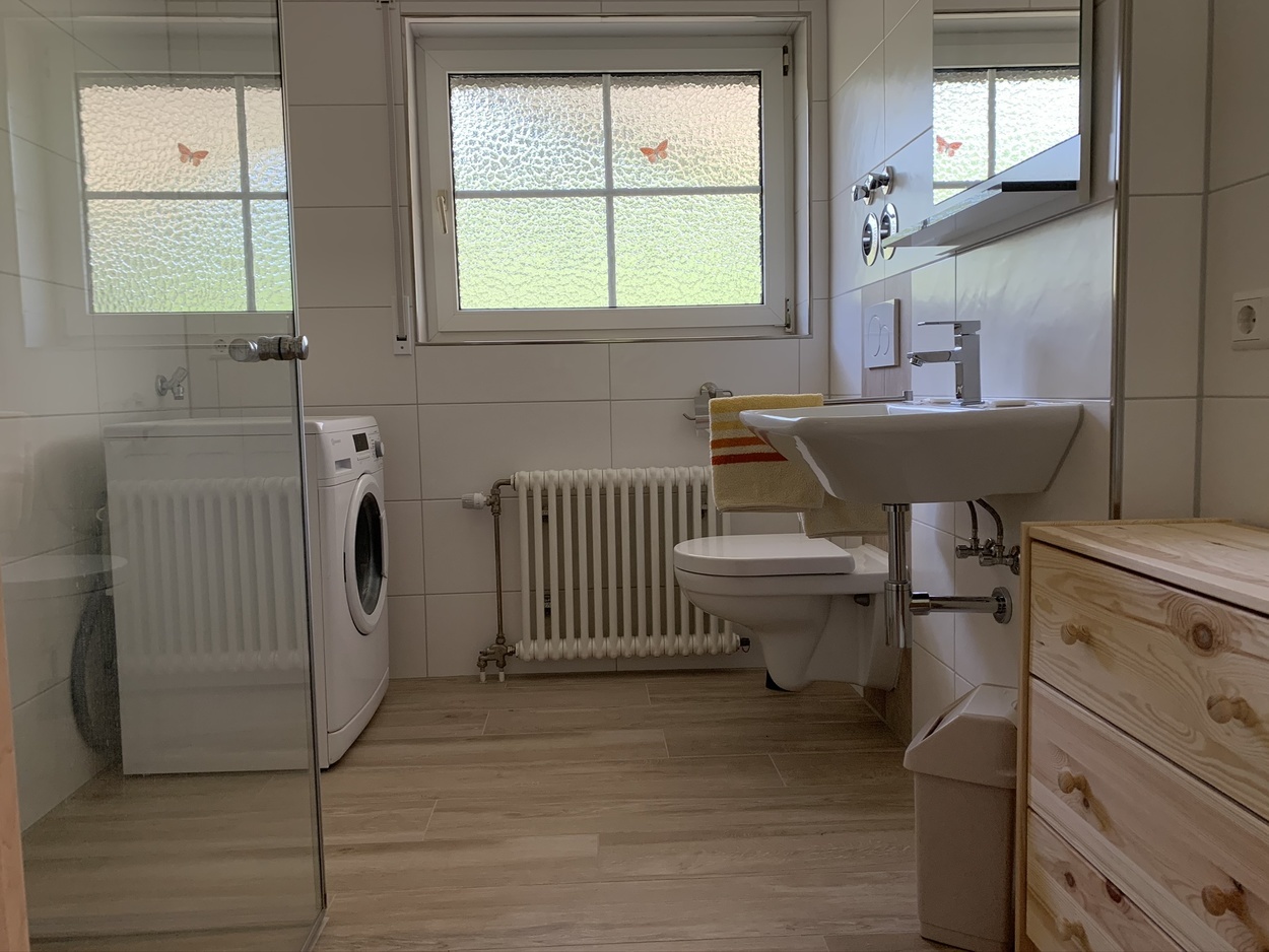 Ferienwohnung Nr. 1 im Erdgeschoss für 2 Personen, die Wohnung ist barrierefrei, hat keine Stufen, eine begehbare Dusche und eine große Erdterrasse auf der man mit der Sonne wandern kann und immer ein sonniges Plätzchen findet. Preis: 55 € für zwei Personen zzgl. Kurtaxe pro Person/Nacht. Jede weitere Person 10 Euro