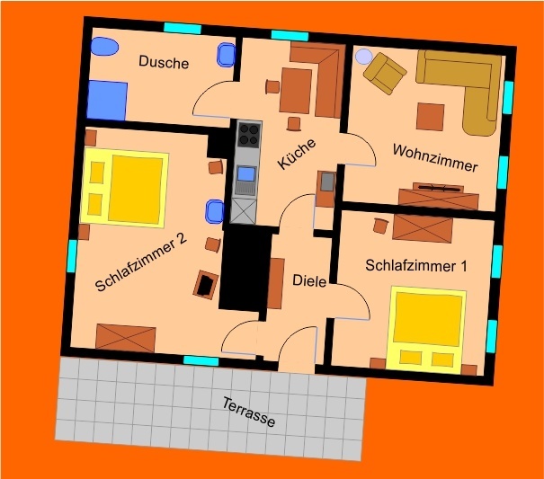 Sie brauchen auch im Urlaub auf nichts verzichten: wir bieten Komfort und Gemütlichkeit für Ihr Wohlbefinden: Unsere überdachte Terrasse ist ideal zum geselligen beisammensein an den schönsten Tagen des Jahres. Unser 7 Tage Brötchenservice wird Sie in Ihrem Urlaub jeden Morgen mit frischen Brötchen verwöhnen. Für Ihre PKW´s stehen Parkplätze bereit. Auf Wunsch stellen wir Ihnen gerne eine Garage zur Verfügung. Außerdem können Sie unsere Spiel und Liegewiese mit Gartengrill nutzen.