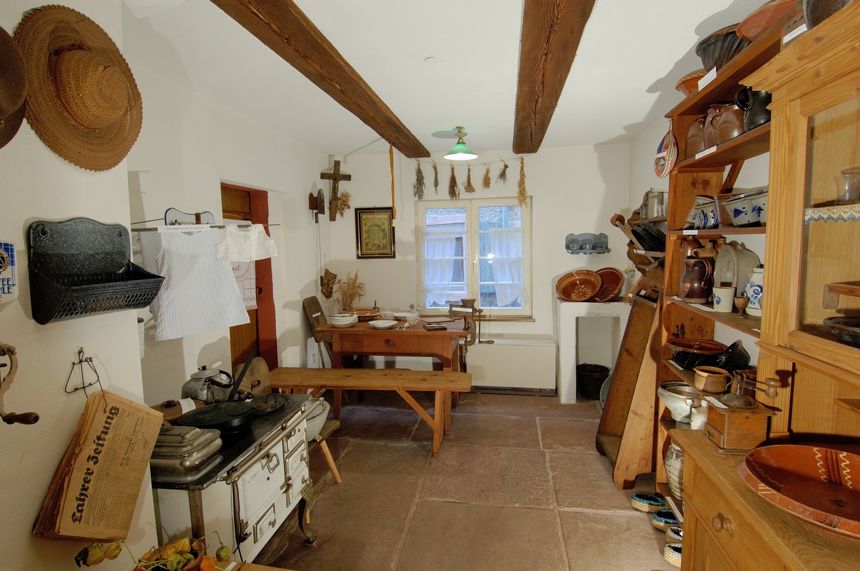 Der Rundgang führt die Besucher ferner in die Küche mit Einrichtungsgegenständen und in den Keller mit landwirtschaftlichen Gerätschaften aus vorindustrieller Zeit.