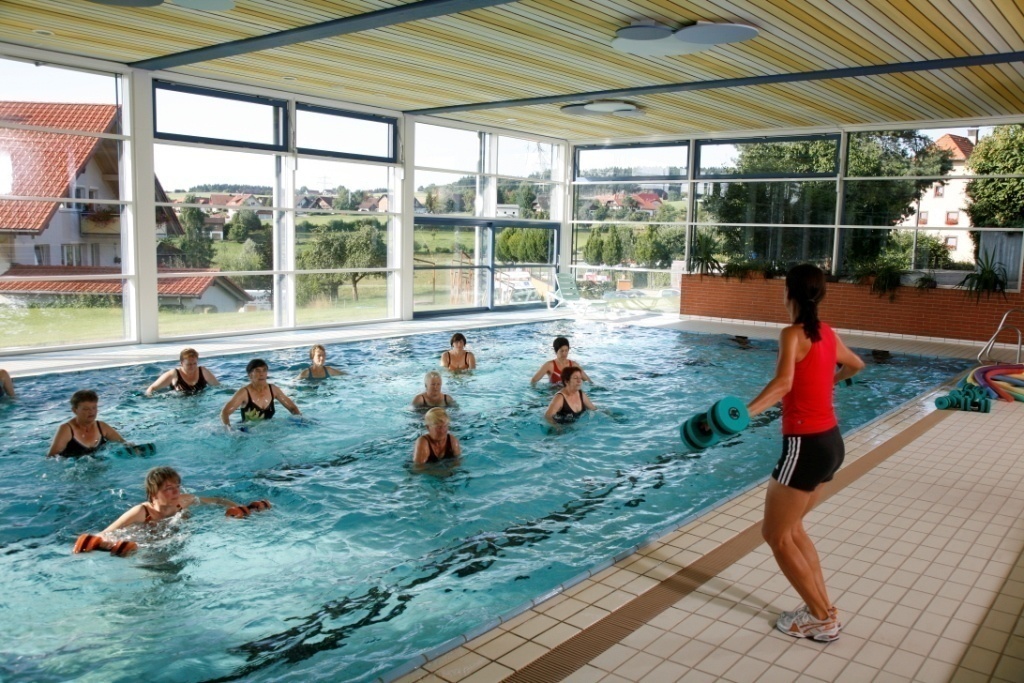 Hallenbad mit Hubboden, durchgehend 29° C, Sauna und Solarium.