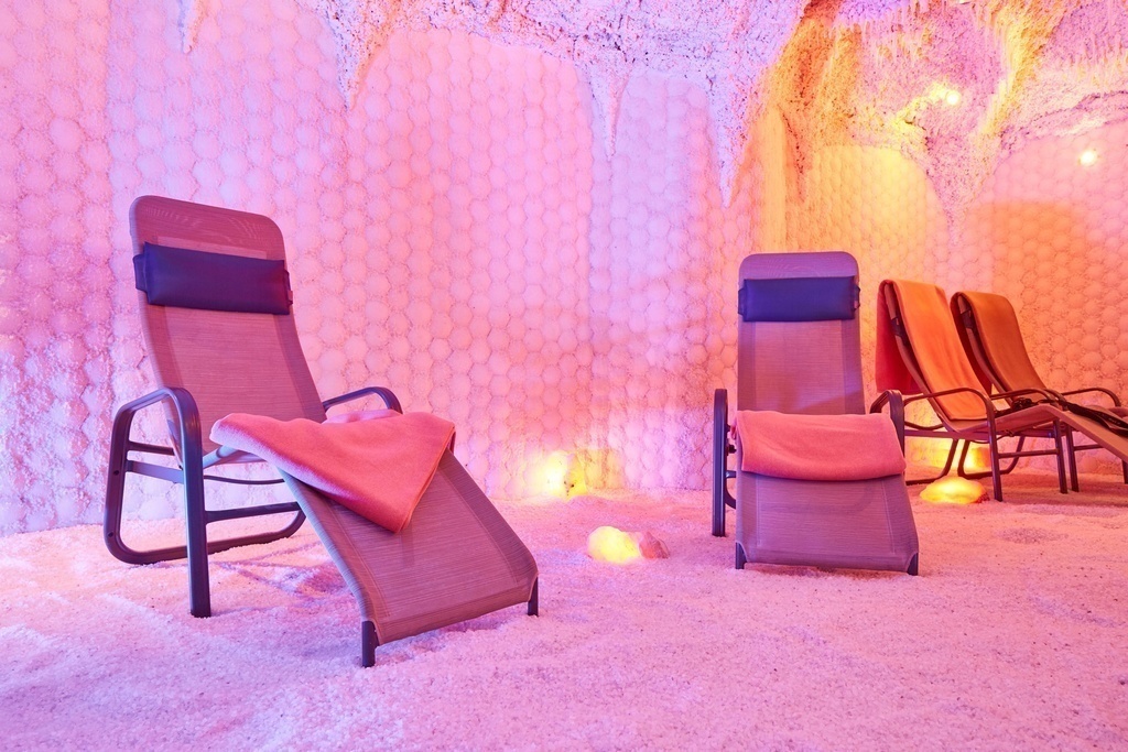 Die Salzgrotte besteht aus rund 12.000 naturreinen Salzriegeln, die die Luft ionisieren. Die Salzluft liefert Iod, Kalzium, Magnesium, Kalium, Natrium, Chloride, Eisen und Selen.
