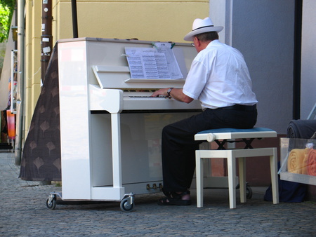 Fast an jedem Samstag mit schönem Wetter (manchmal auch an anderen Tagen) verzaubert der Senior-Chef des Bettenhauses Stiegler, das ebenfalls an den Augustinerplatz angrenzt - Gottfried Beck- den Platz mit herrlichem Klavierspiel. Eines seiner zahlreichen kleinen Konzerte dieser "Freiburger Institution" sollten Sie sich nicht entgehen lassen.....
